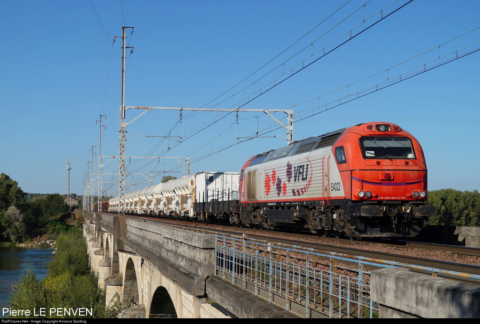 | Passage on the warning on the viaduct of Montlouis/Loire of the work train XDK2 composed of the "Dégarnisseuse RM95-800 Meccoli" framed by an Euro 4000 VFLI and a BB75000 Akiem, return from site (Renewal-Way-Ballast between Blois and La-Ville-aux-Dames) and towards the rear base of St-Pierre-des-Corps. |