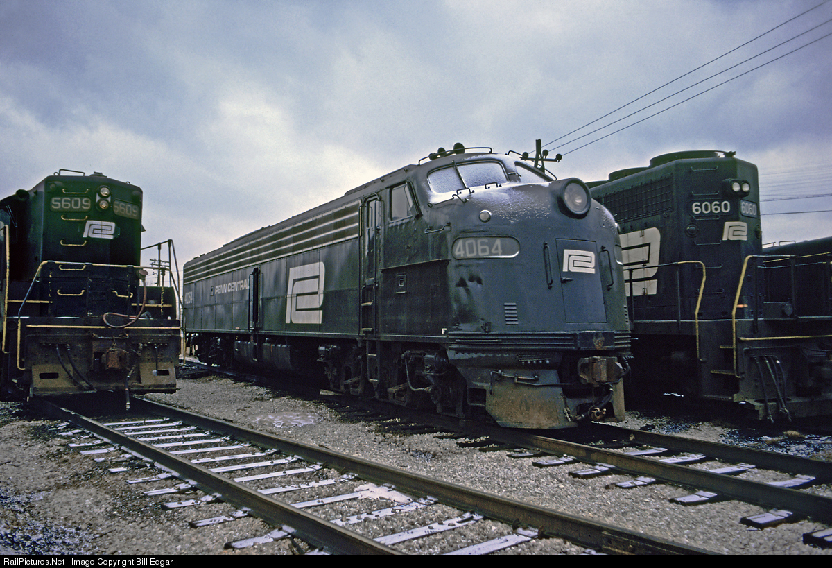 | It's a cold January day in 1976 and rather weird to find a Penn Central E8 parked at their 56th St. Yard in Chicago with fellow EMD power, GP7 5609 and SD40 6060. The 4064 survived the winter and formation of Conrail in April 1976 and was restored back to its 1953 New York Central color scheme. Conrail retired no. 5609 in April 1976. PC 6060 was biult as Pennsy 6060 in Feb. 1966. Made it to Norfolk Southern. |