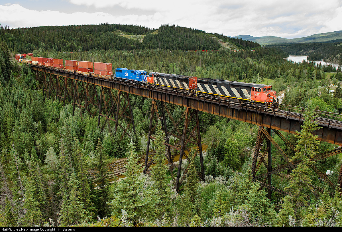 CN C40-8Ms 2413, 2402 and CEFX SD60 6017 lead train Q116 across the Prairie Creek trestle.