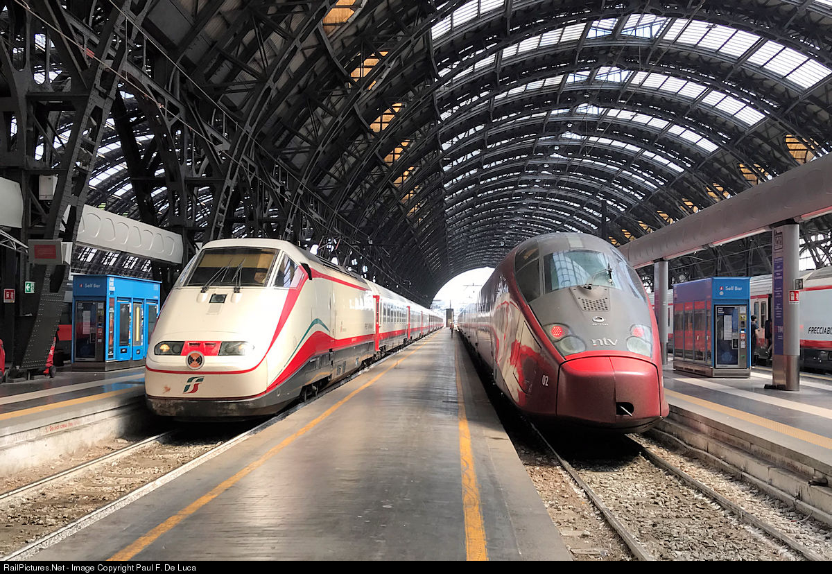 | An Italian State Railways Frecciabianca train led by an E.414 class locomotive arrives at Milan Central Station next to one of the Alstom AGV trains operated by NTV. |