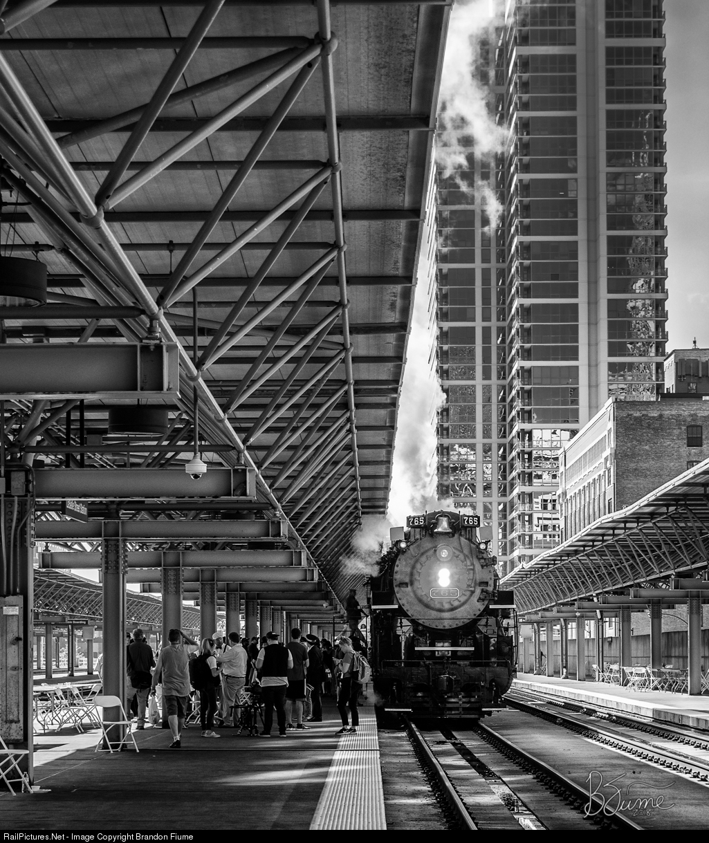 The Joliet Rocket, led by NKP 765, has arrived into LaSalle Street Station. The exposed structural supports for the platform's canopy create an industrial form and shape that is reminiscent of Chicago industries in the 1940s. While the glass building in the background certainly wasn't built during the steam era, it's architecture, shape, and contrasting tones in black and white almost make the structure look natural in this scene.