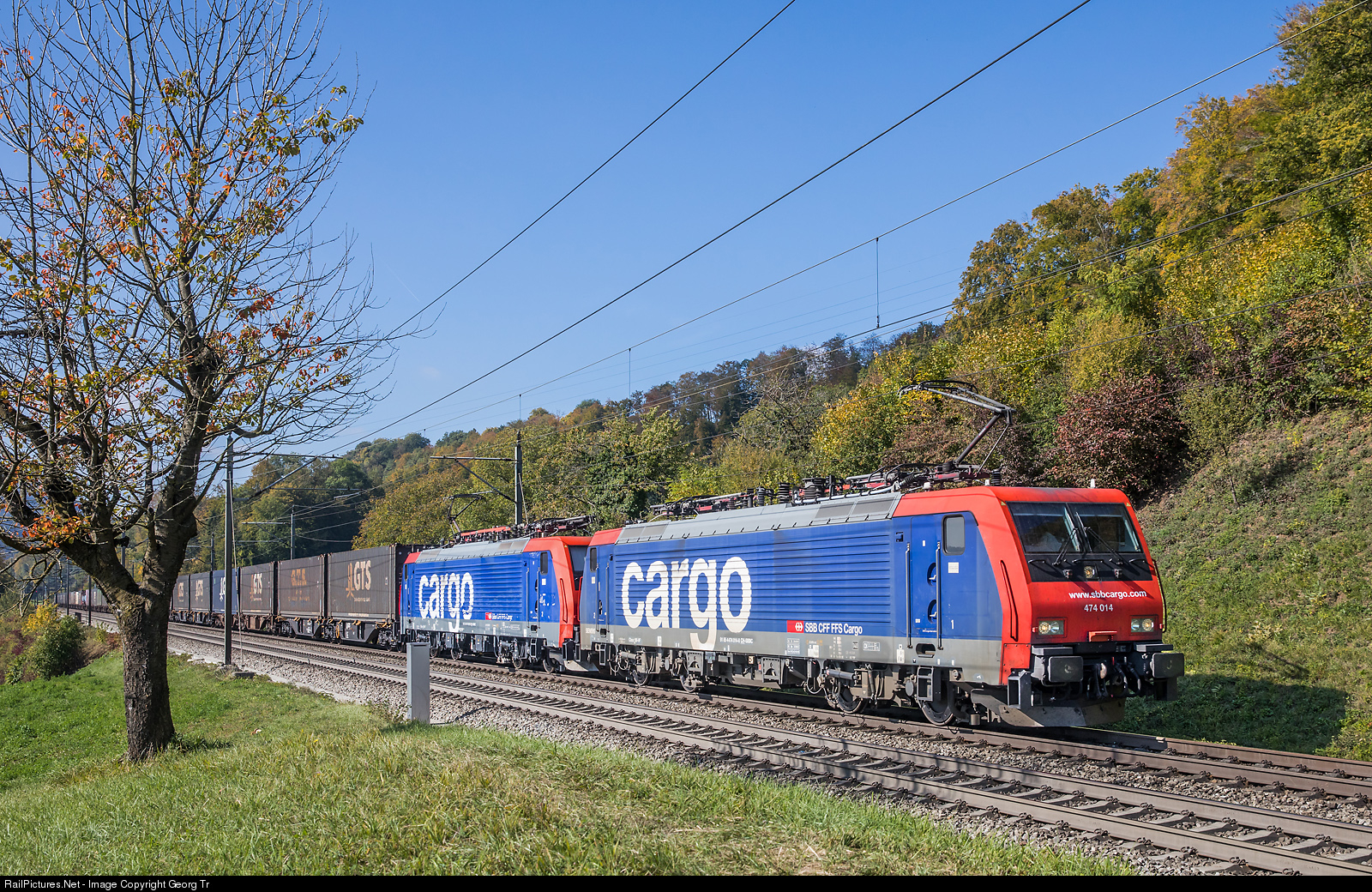 | Re 474 # 014 and # 002 in multiple traction are pulling southbound GTS intermodal train 40119 from Rotterdam Botlek/Netherlands to Milano Smistamento/Italy on the Bözberg south ramp towards the Gotthard. |