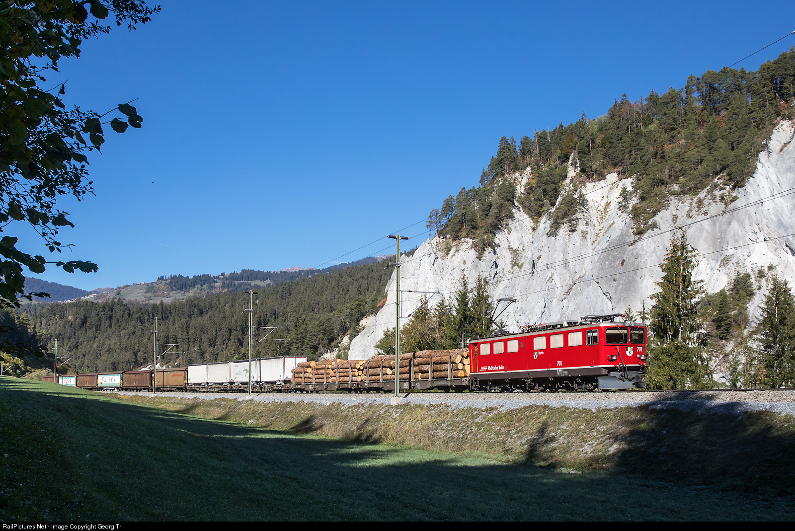 | 60 years old "warhorse" Ge 6/6 II # 701 "Rhätia" is pulling freight 5732 from Ilanz to Landquart, transporting log and mineral water "Valser". The train is running through the gorge of the Vorderrhein, called Ruinaulta, between Valendas-Sagogn and Versam-Safien. |