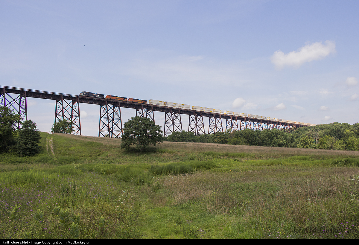 In what was the 2nd rare sight of the summer over Moodna Viaduct, (First being the Union Pacific Dinner Train) a detoured 20W intermodal train is seen crossing Moodna Viaduct with a pair of Exciting BNSF GEs ™ trailing.. This marked the 1st time in over 10 years an intermodal train traversed over the Moodna Viaduct..