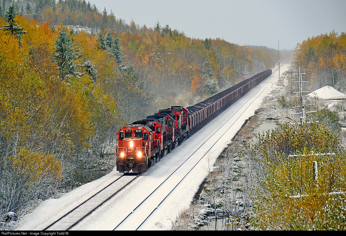 | CN 6017 leads 145 cars of taconite pellets from U.S. Steel Minntac and head towards Two Harbors, MN under grey skies, cold temps and fresh fallen snow mixing in with fall colors across the landscape of northern Minnesota. |