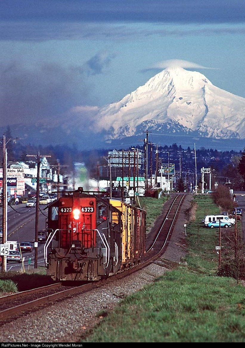 | A Southern Pacific local heads west (timetable east, of course) on the Tillamook Branch in the southwest suburbs of Portland. A late winter storm has dumped some fresh snow on Mt. Hood. |