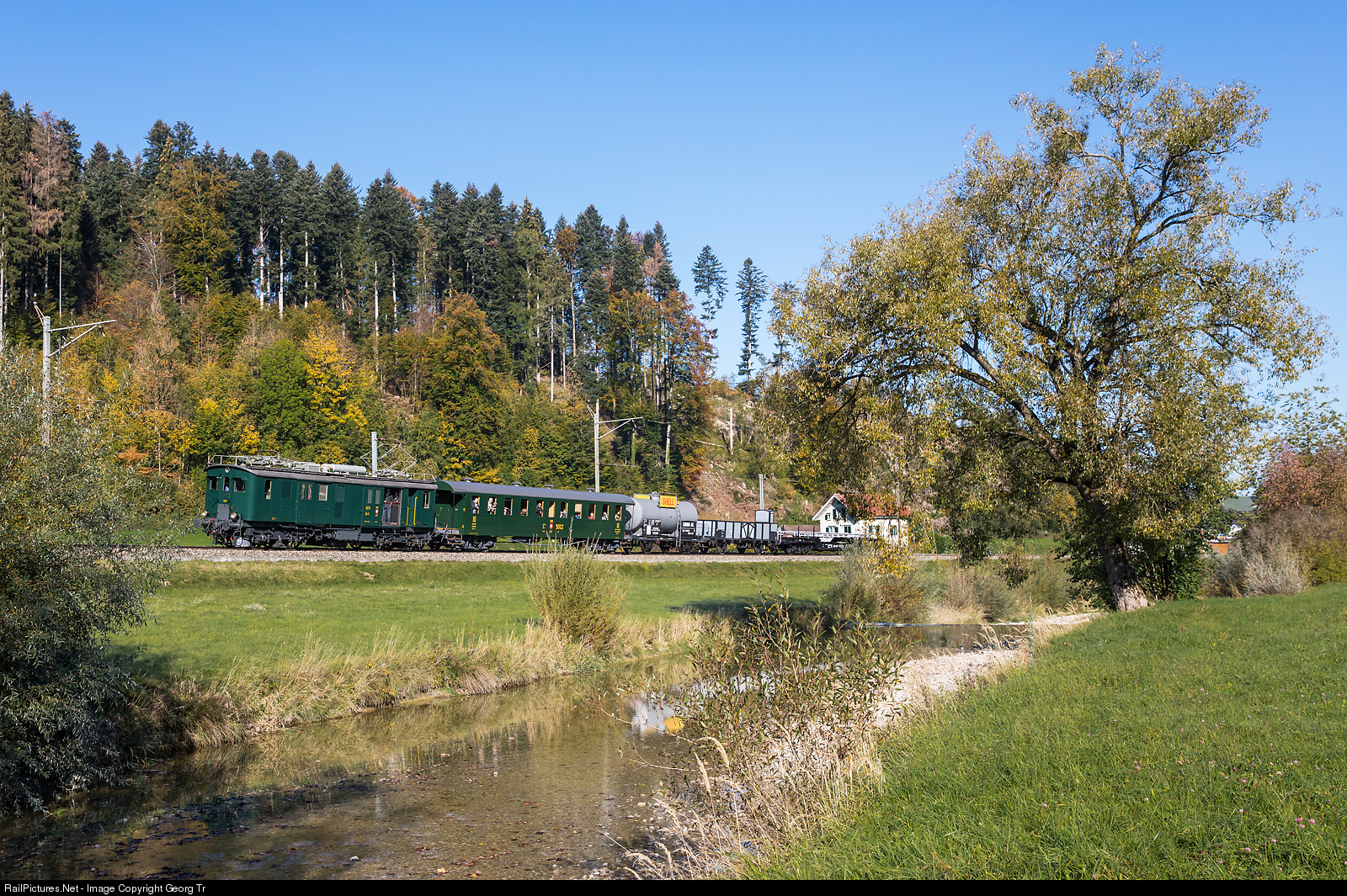 | Baggage railcar De 4/4 # 1679 of SBB Historic Winterthur, is on the way along the Töss creek to the railcar meeting at Bauma, near Juckeren between Saland and Bauma. The railcar was built in 1928 by SWS and SAAS, it is pulling third class passenger car C4 # 9002 of SBB Historic from 1909 (SIG Neuhausen) and three beautiful restored vintage freight cars of the DVZO (Dampfbahn Verein Zürcher Oberland). |