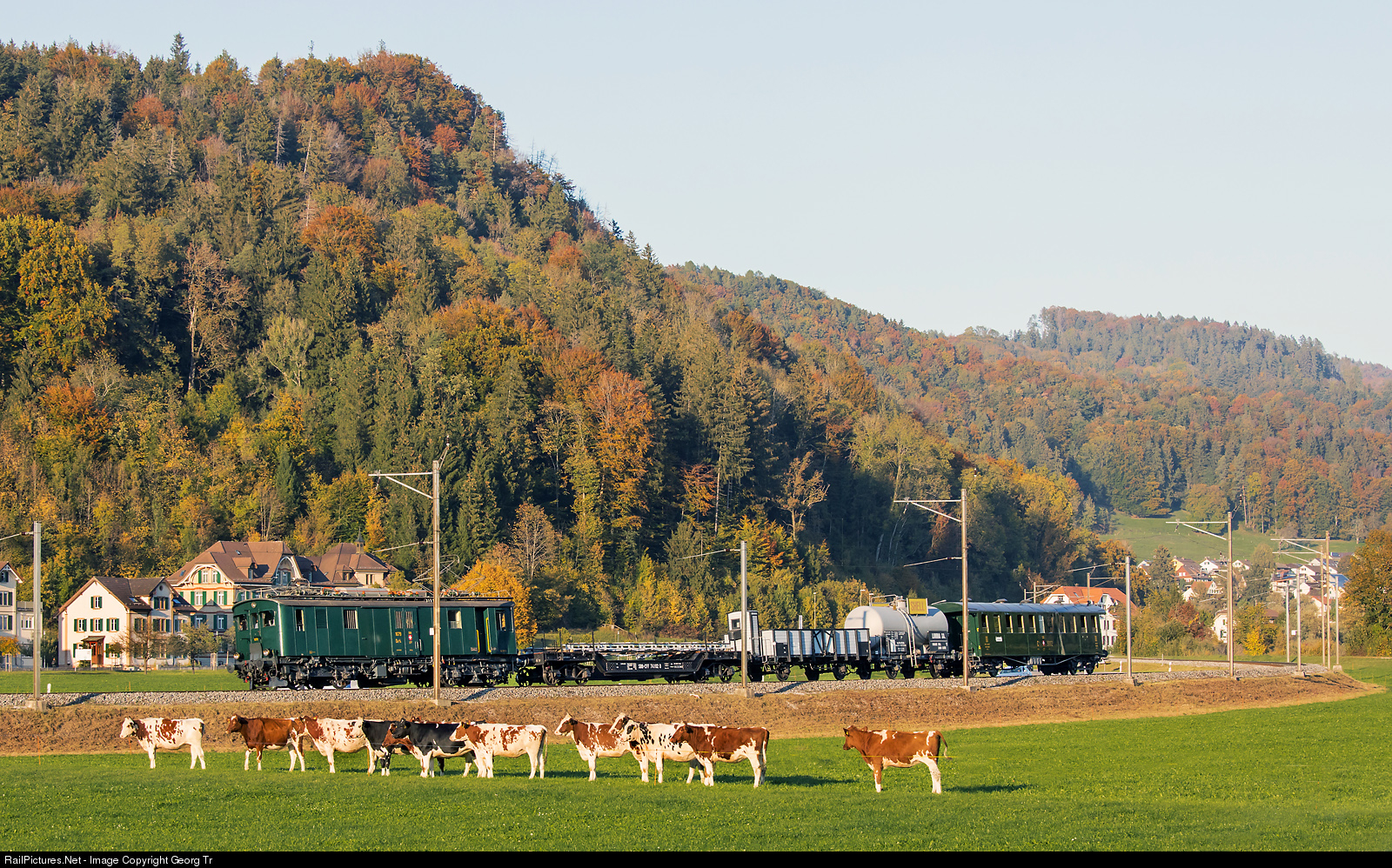 | Baggage railcar De 4/4 # 1679 of SBB Historic Winterthur, with a mixed passenger and freight train from Bauma to Winterthur, on the occasion of the railcar meeting Bauma 2018. The railcar was built in 1928 by SWS and SAAS, it is pulling third class passenger car C4 # 9002 of SBB Historic from 1909 (SIG Neuhausen) and three beautiful restored vintage freight cars of the DVZO (Dampfbahn Verein Zürcher Oberland) near Rämismühle-Zell. |