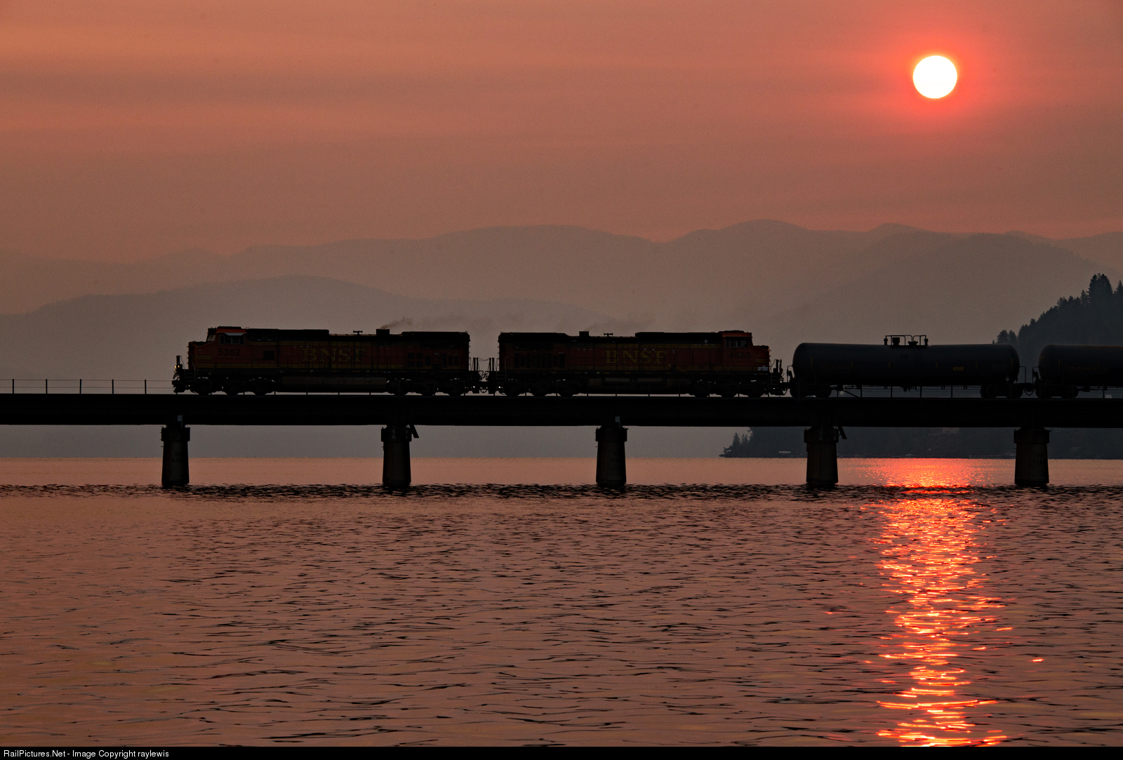 | For years I have always wanted to visit the famous, well documented bridge over Lake Pend Oreille in Sandpoint Idaho. In 2018 we made two trips. In August fires from the smoke created some fantastic sunrises! Here a eastbound manifest crosses the lake in front of a fantastic sun. |