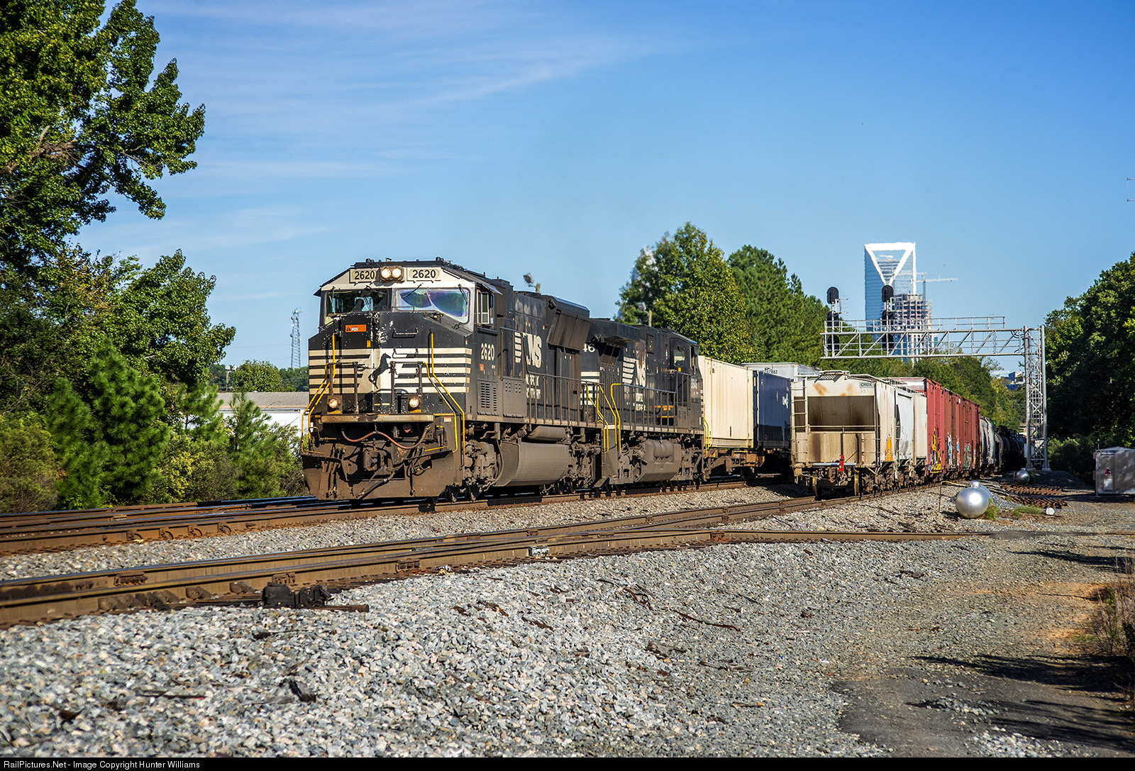 | Norfolk Southern southbound intermodal train 213, left, passes a tied-down manifest train at Charlotte Junction in Charlotte, NC on October 13, 2018. |