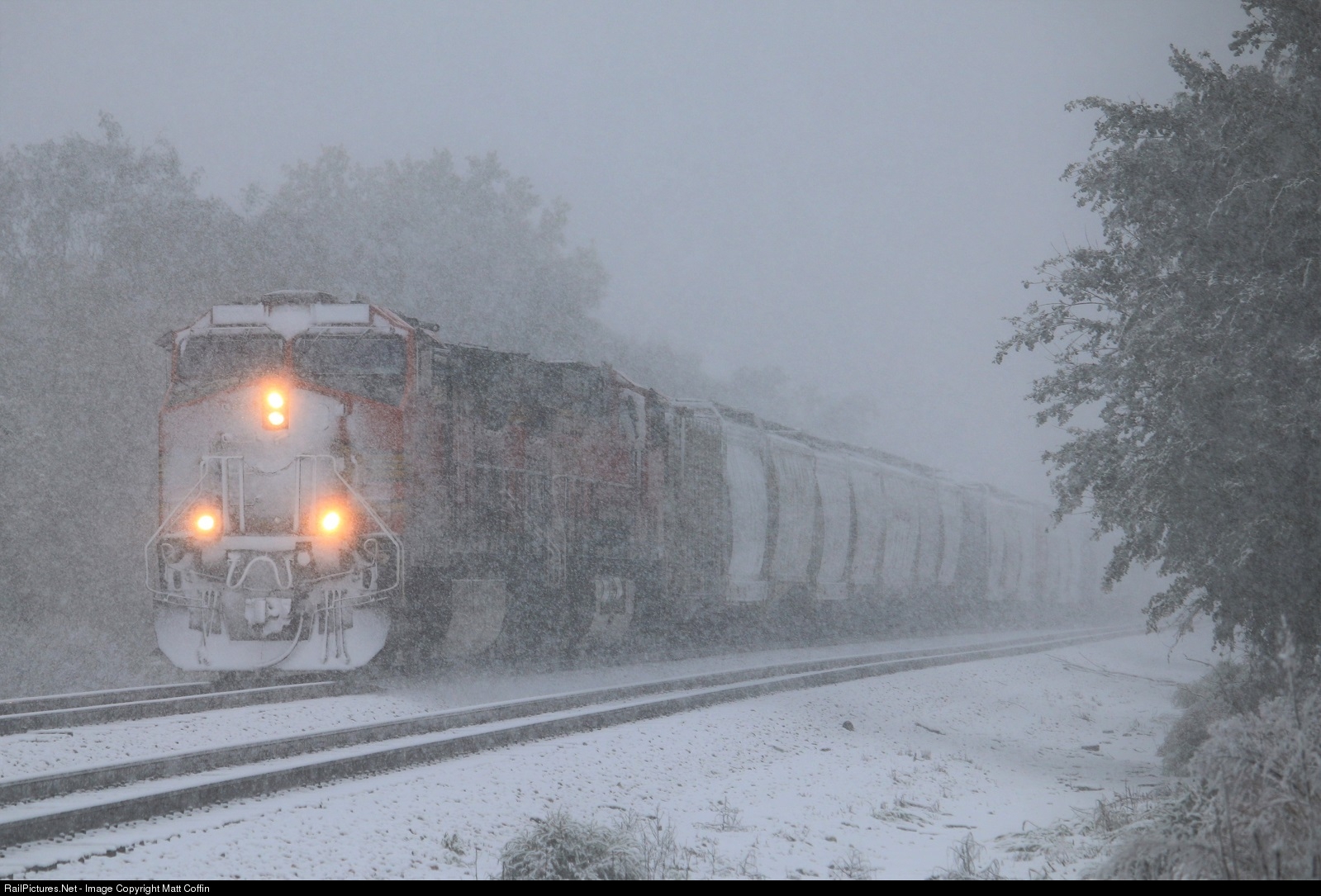 "It's an October blizzard here in Nebraska!" are the exact words of the conductor on this sand train as it plows through a rare October snowstorm.