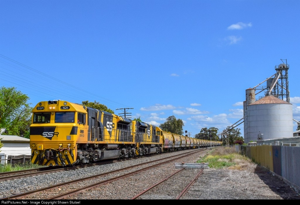 SSR's SSR101 and SSR102 thunders through Horsham, Victoria with 7KS2, Loaded Grain Service, bound for Enfield, Sydney, ex Dimboola... This was the first time this class had visited Victoria... Date 13/10/18