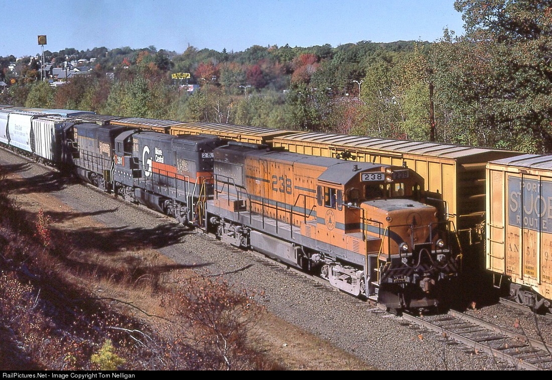 Three Maine Central U-Boats, all acquired secondhand, will be working uphill as they depart Gardner, MA, with Boston & Maine train MERU (Mechanicville, NY, to Rumford, ME, via B&M/MEC). Lead unit 238 is an ex-Rock Island U25B; behind it are two ex-Delaware & Hudson U23Bs transferred to the MEC by the Guilford organization, one in Guilford paint and the other still in D&H blue and gray.