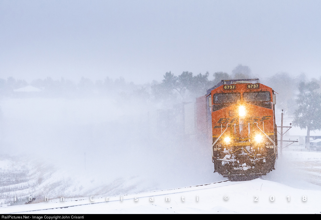 A cold front from the north moved in overnight bringing the first measurable snow of the season across the Front Range. BNSF ES44C4 No. 6737 leads a southbound stack train up Berthoud Hill near Berthoud, Colorado, on October 14, 2018, while kicking up some of the fresh powder.