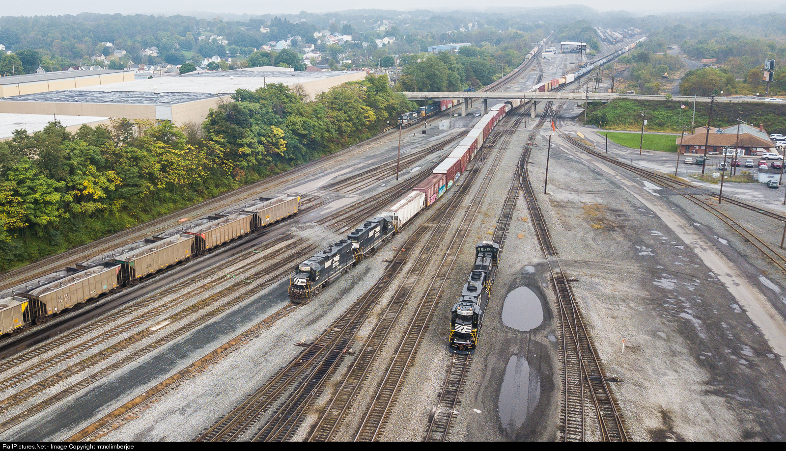 Two sets of yard power work at Norfolk Southern's yard in Altoona as a manifest freight eases through on the mainline.