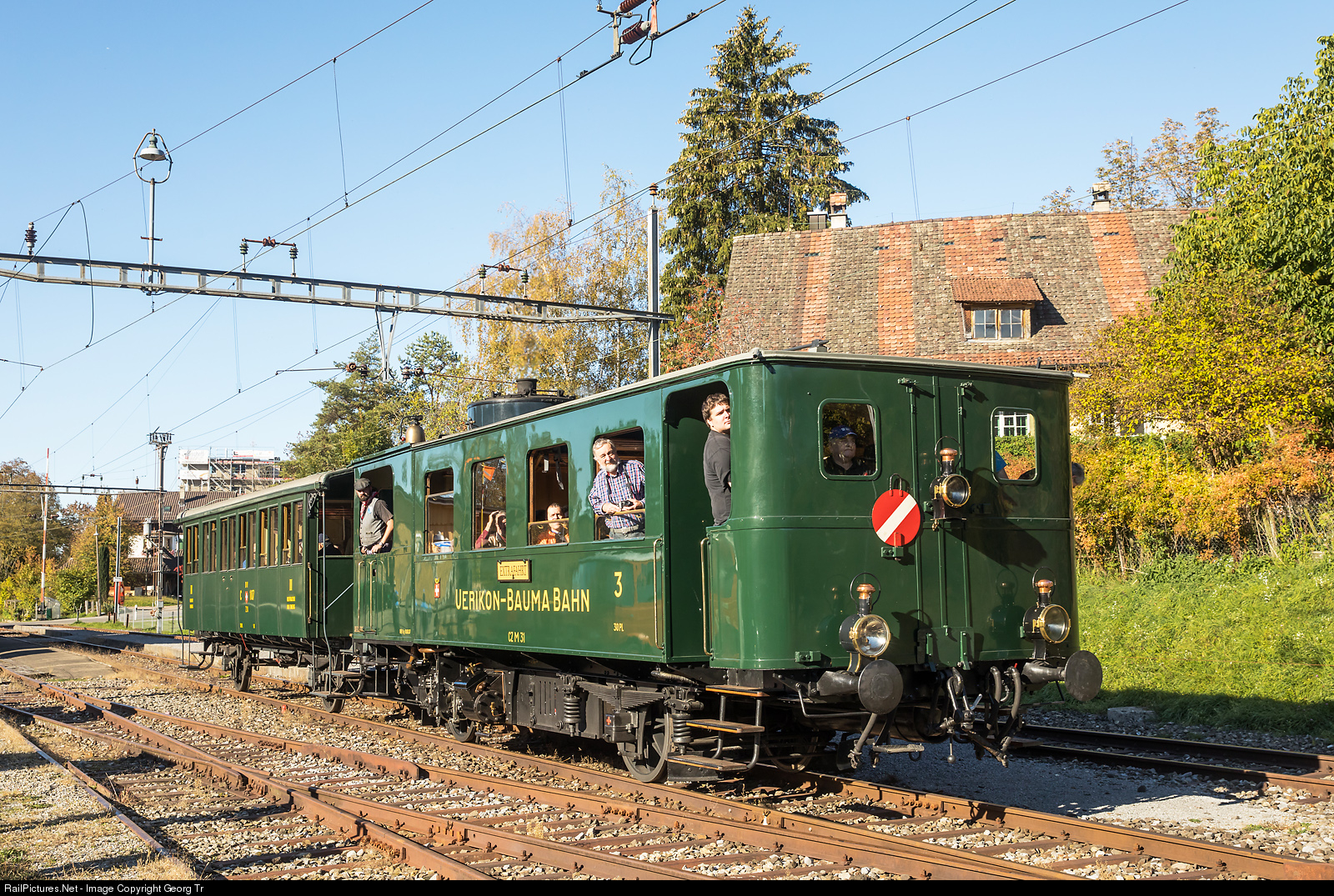 The unique steam railcar CZm 1/2 # 31 of SBB Historic, maintained and operated by steam group Zürich, built in 1902 by Maschinenfabrik Esslingen/Germany, is on his home line, the Uerikon-Bauma Bahn, leaving Bäretswil when running train 451K from Hinwil to Bauma, on the occasion of the vehicle meeting 2018. It is pulling car C # 107 of the DVZO.