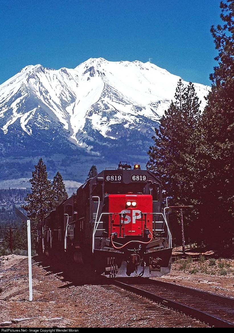 An eastbound train on the Siskiyou Line is descending the grade into the Shasta Valley near Weed. Lead unit SP 6819 is now preserved at the California State Railroad Museum.