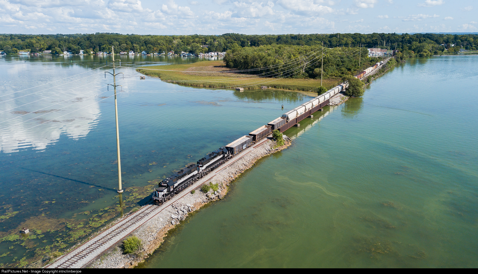 The Finger Lakes Railway's GS-2 heads west as it eases across the causeway over Cayuga Lake. A pair of GP38-2 in NYC lighting stripes on the point of today's train.