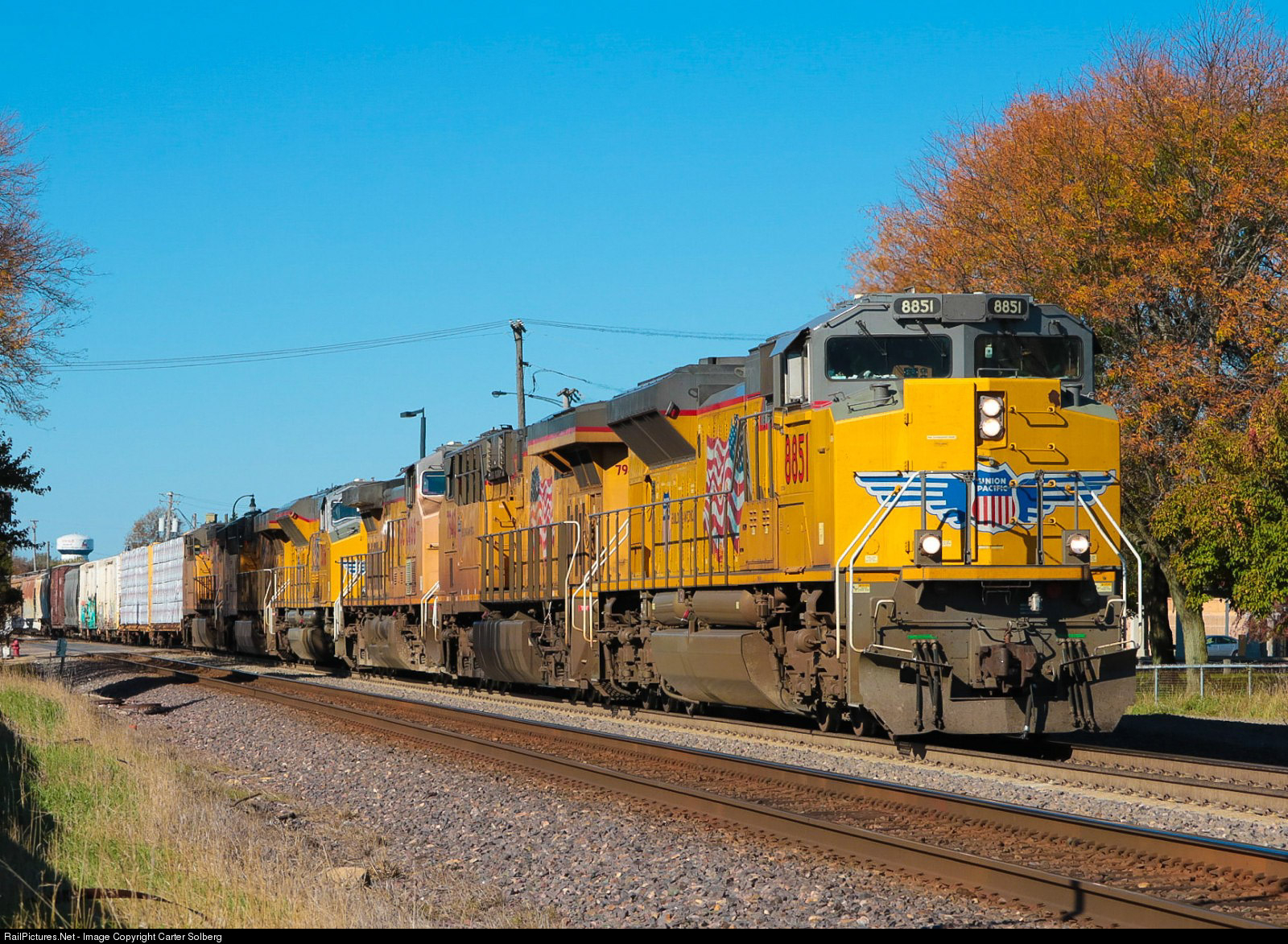 Union Pacific 8851 leads a manifest through Dekalb Illinois on a beautiful October morning.
