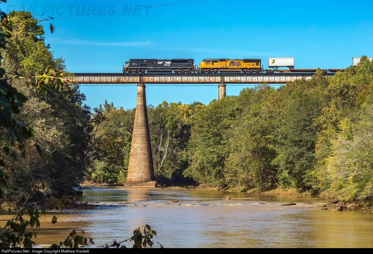 Hot shot 213 with 80MAC 7217 leading charges south over the Southern Railway bridge at Converse, SC. I will add that this was a beautiful fall day.