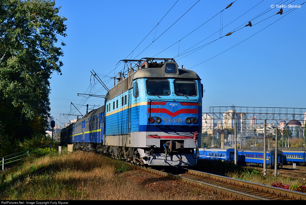 The electric locomotive CHS4-036 with passenger train #36 Warshaw - Kyiv. This electric locomotive built by Škoda in 1967 as type Škoda E52E4. In 2006 this electric loco modernized by ZERZ (Zaporizhzhia Electric Locomotive Repair Plant) with replace body from plastic to steel.