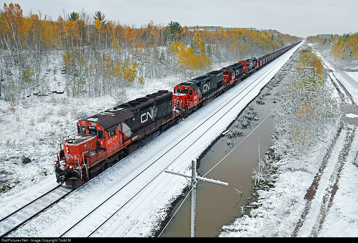 | A cold and windy day following the first significant snow of the season interacts with remaining color of the fall season that still hangs on across the landscape. The colors of CN add a little to the overall scene. |