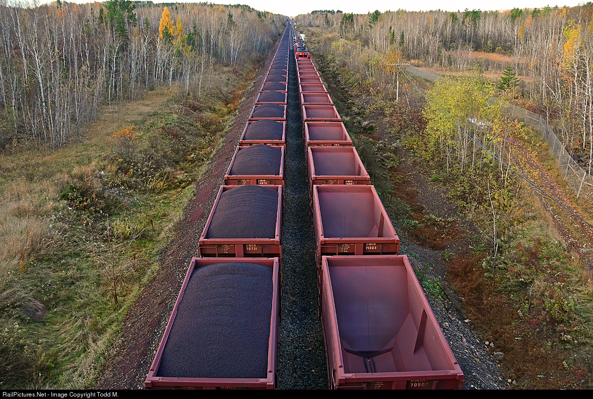 | Loads pulled by a trio of GE Dash 8's meet empties pulled by a quad set of EMD SD40-3's on the double track section of the CN Iron Range Sub at Gilbert. With both trains moving in opposite directions it took a few tries to get the cars lined up for a side by side comparison. |