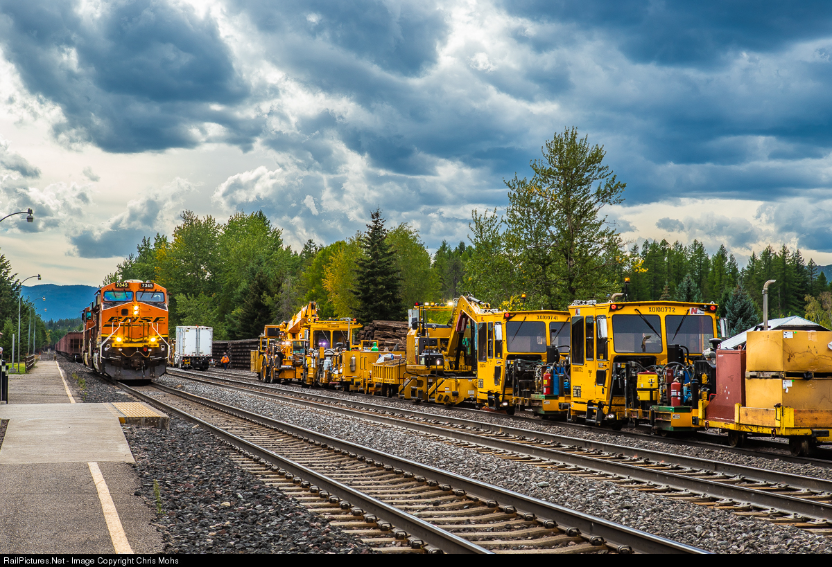 | Plenty of tie replacement, rail work, and shed repairing is taking place along the Hi Line Sub. Throw in a fire near Essex and there's a lot of activity. MOW equipment is tied up for the Night at the Belton yard. The engines for the Hezog Rock Train is going to be running around the cars in the background for the pull back to Whitefish. |