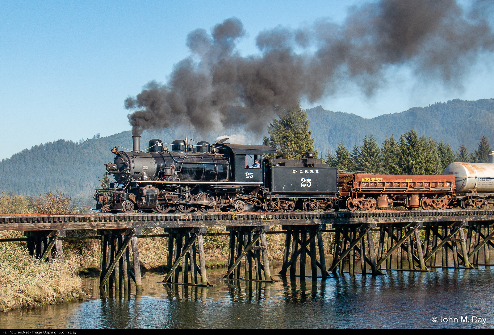 McCloud River Railroad 25 manages to catch the sunlight, even on the smokebox door, as the Oregon sun sinks into nearby Tillamook Bay.