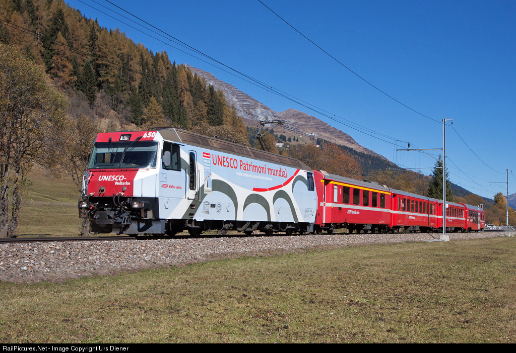 | Ge 4/4 III 650, painted in the publicity paint scheme for UNESCO World Heritage Albula Bernina, is pulling the R 1825 from Davos Platz to Filisur. |