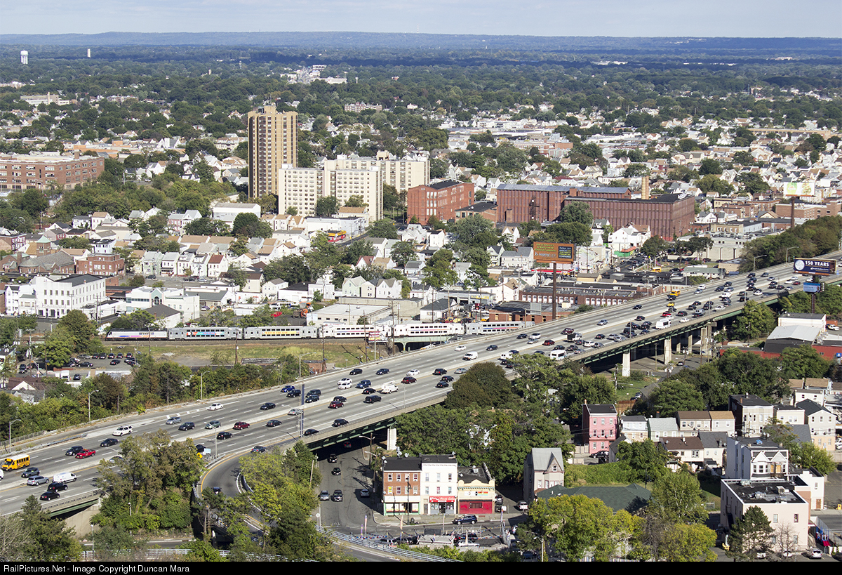 | NJT ALP45-DP #4507 pushes NJTR 1220 through Paterson towards Hoboken upon departing Paterson Station. Currently on the former Erie Newark Branch, its about to use the connection that will carry it onto the former DL&W Boonton Line for the rest of the trip east. |
