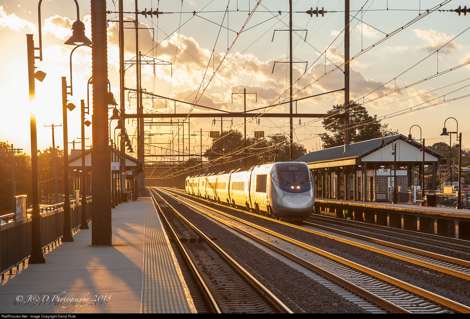| Eastbound Amtrak Acela Express train #2172, running on the normal westbound main due to a disabled Keystone Service train at Torresdale, races the setting sun as it rolls through the SEPTA station at Croydon, PA. The 105 mph signs hanging from the catenary are illuminated by the setting sun. |