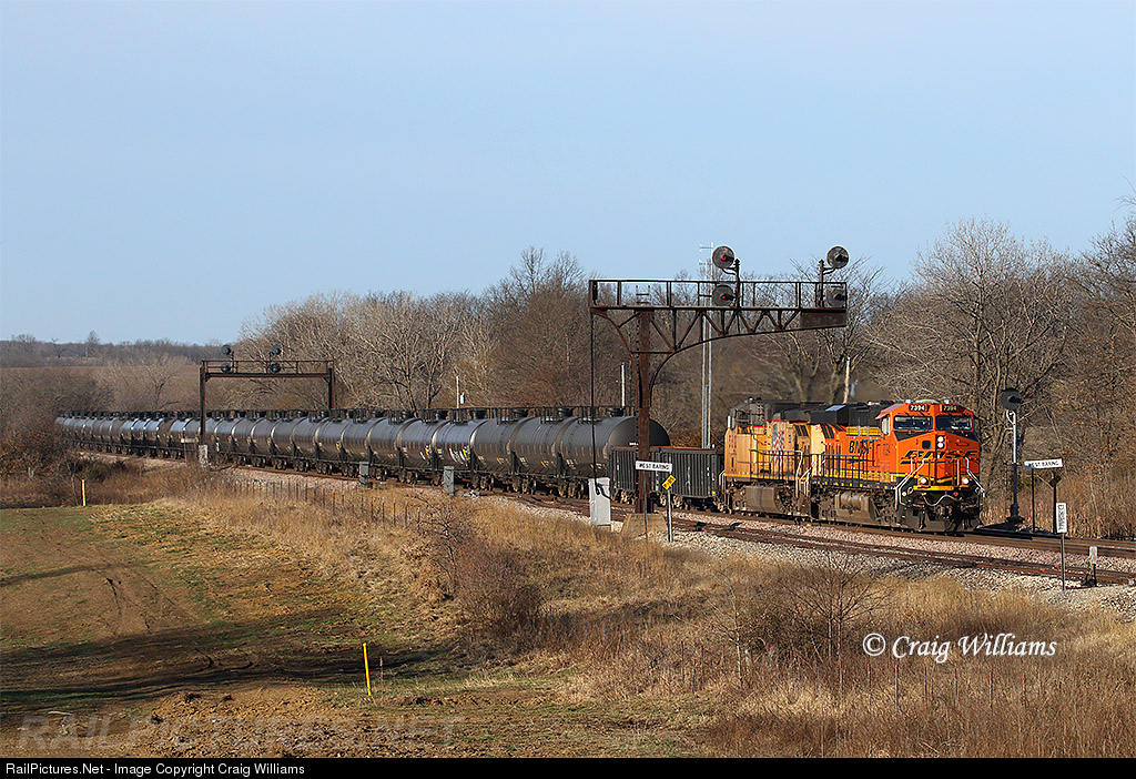 | Just made a trip down to the Marceline Sub in mid-September 2018. New shiny hardware is now in place to replace these aging ex-Santa Fe signal at West Baring. Back in 2017, a happier time was seen here as this unit train of tankers head back to the CSXT from Oklahoma. For whatever reason West Baring was overlooked when the BNSF went thru in 2012-13 area and replaced all the ex-Santa Fe signals at the control points on this subdivision with new signals for the PTC upgrades. For some reason the Santa Fe Signals would moves til October 2018. |