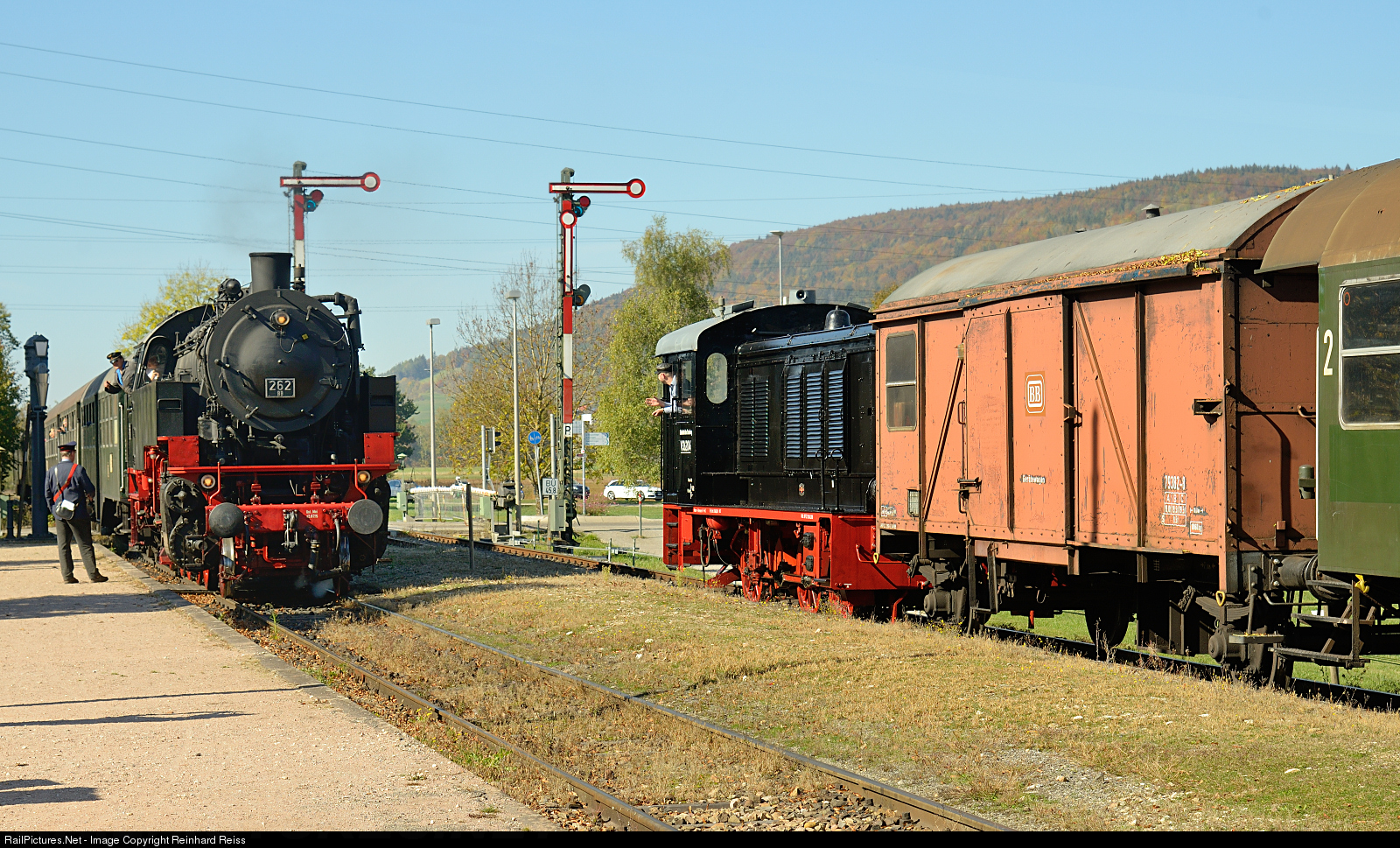 | FK262 (BB 262) from Bahnbetriebe Blumberg reaches Zollhaus-Blumberg station with the morning train from Weizen. On the right V36 204 waits for free way with the so-called "Wanderzug" (hiker train) down to Weizen. |