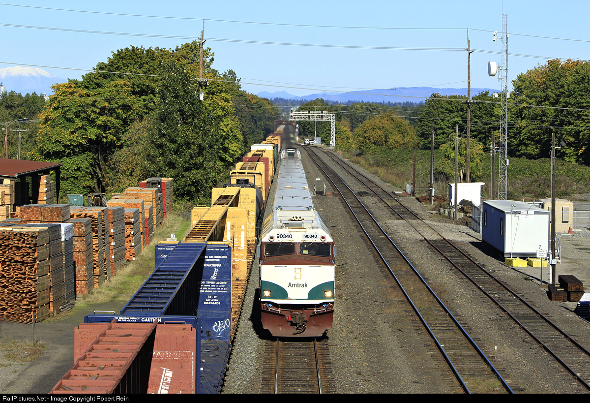 Southbound Amtrak almost to Union Station. Mount Saint Helens is in the background.