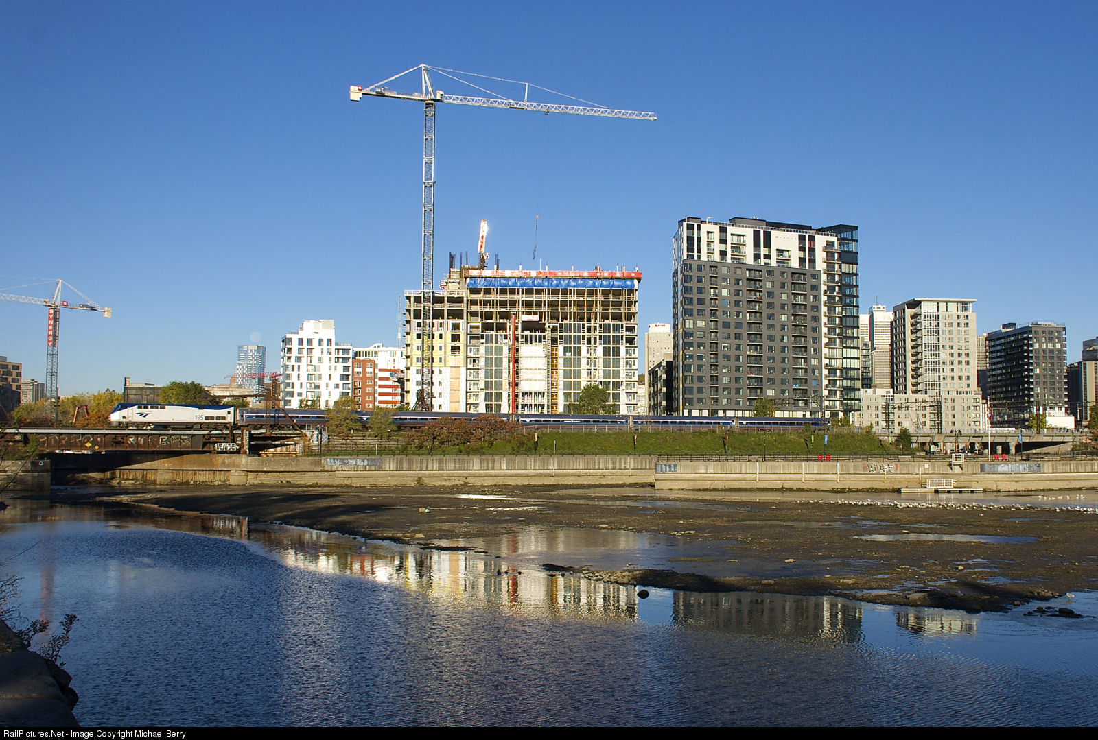 | No Great Dome today. The Great Dome car is supposed to be on AMTK 68 on Tuesday, Friday and Sunday until November 2nd, but I was out of luck when I shot 68 in Montreal today. Later I would find out it is out of service with shelled wheels. Here AMTK 195 shoves the train towards Central Station, with 5 Amfleet cars. |