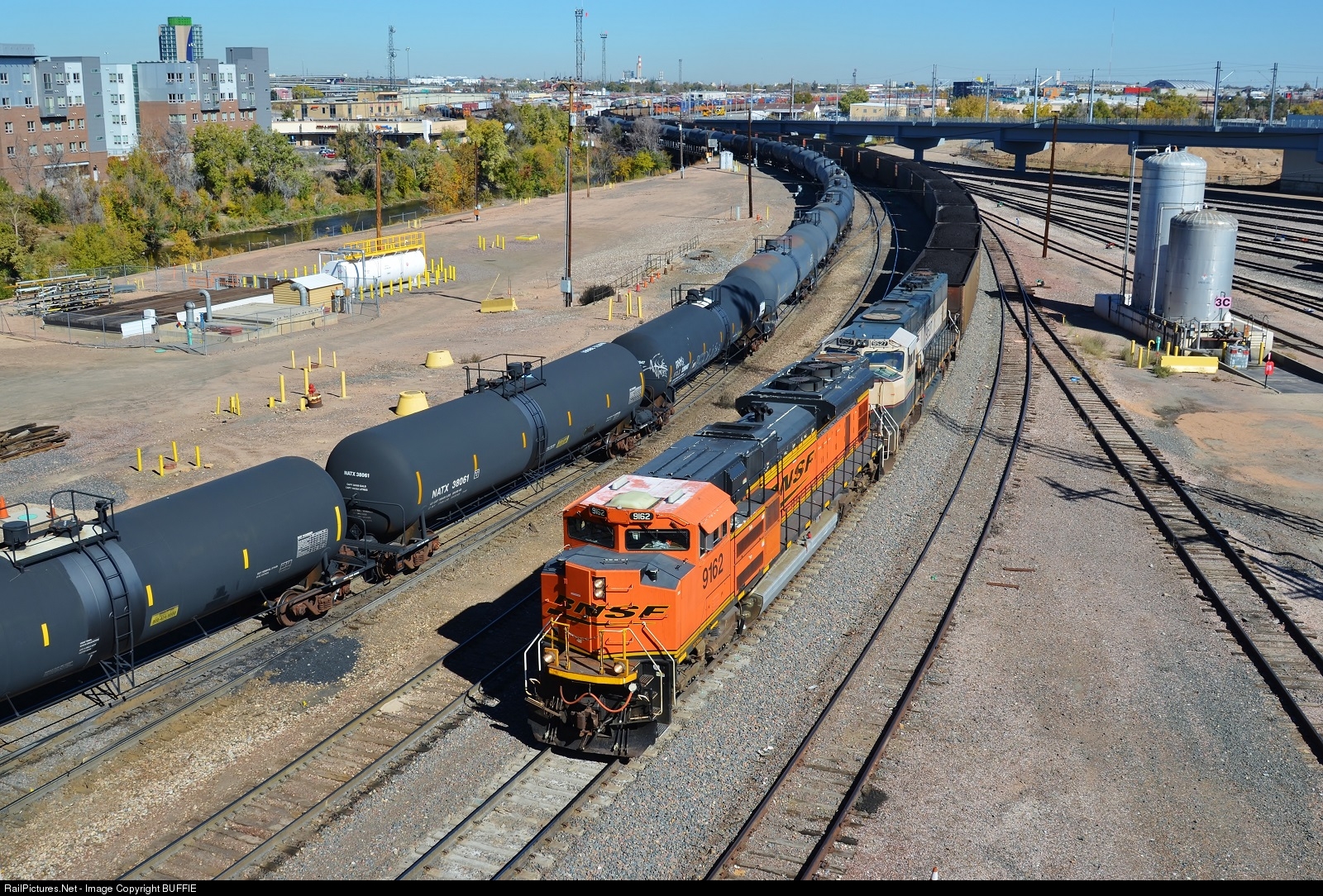 | Coal and oil pass through the Denver Yard. BNSF 9162 (SD70ACe) leads a loaded coal train south towards the Joint Line and Colorado Springs while a string of empty oil cans heads east towards the refineries of Commerce City, Colorado. |
