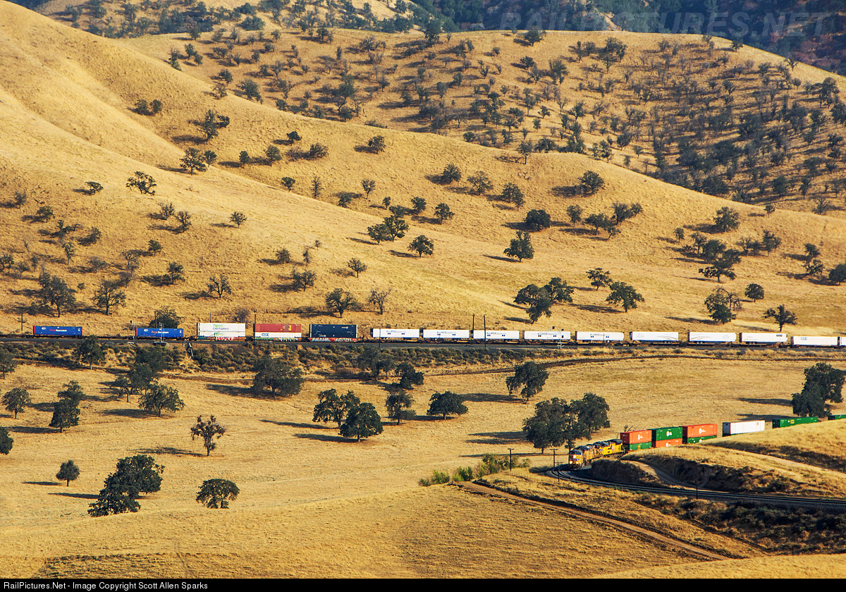 | With the winter and spring months of 2016 being extremely green on Tehachapi, it meant that the summer wild grasses of 2016 would be both extremely golden and very tall as well. In spots, it was easily up to my waist line. For these shots you have to carefully navigate your way up through the tall wild grasses, making sure to keep an eye out for rattlesnakes. Summers for me on Tehachapi can be a hit or miss on shots because of the lack of cloud cover. The only great shot opportunities come right at sunrise or sunset. Here a northbound UP intermodal slowly drifts down the golden hills and is exiting the Allard horseshoe curve while the rear portion of the train can be seen in the background approaching the curve. |