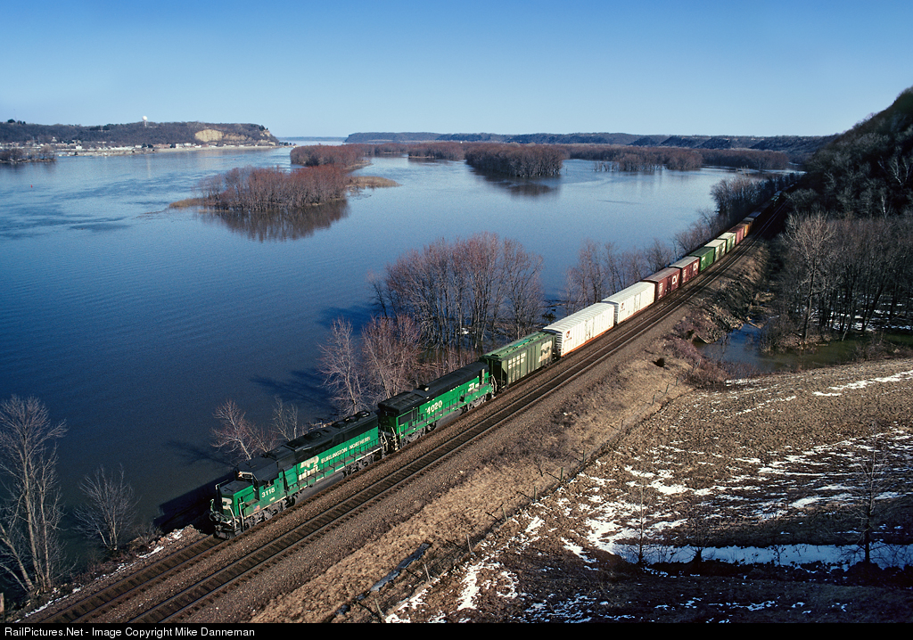 Burlington Northern freight train 104 is still in Wisconsin as it approaches East Dubuque, Illinois, while tracing the banks of the Mississippi River on April 3, 1993. The eastbound train is powered by EMD GP50 No. 3118 and GE B30-7A “B unit” No. 4020.