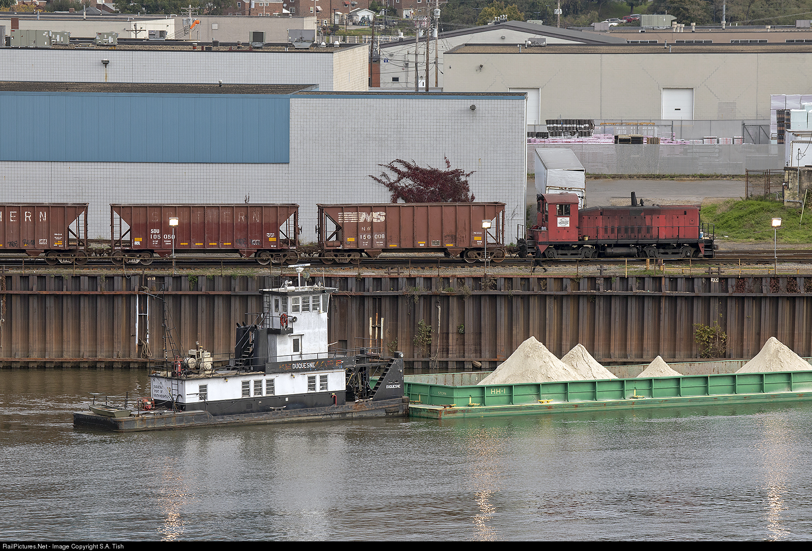 Where rail meets river. The Mol-Dok works empty NS hoppers preparing to move them to the NS interchange while the G.M. Crain River Towing towboat Duquense works a barge of stone that was dumped out of those hoppers.