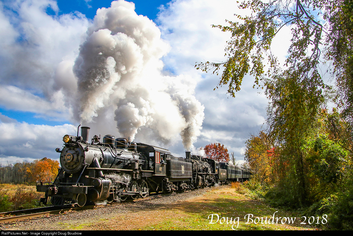 For the first time in almost a decade, 1926 Alco-Cooke built 2-8-0 #97 pulls a revenue train for the Connecticut Valley Railroad. The locomotive just came out of the shops following an overhaul. Old 97 was originally built for export to Cuba but was instead delivered to the Birmingham Southern Railroad as #200. In 1964, she began running as Vermont Railways #97 before being sold to the Valley Railroad in 1970. On the day of this photo, she was used as the lead engine in a double-header excursion for the Mass Bay Railroad Enthusiasts along with #3025, 1989 Chinese Mikado built to look like a New Haven Railroad J-1. Connecticut Valley Railroad is now one of only a handful of railroads in the United States with three operable standard gauge steam locomotives.