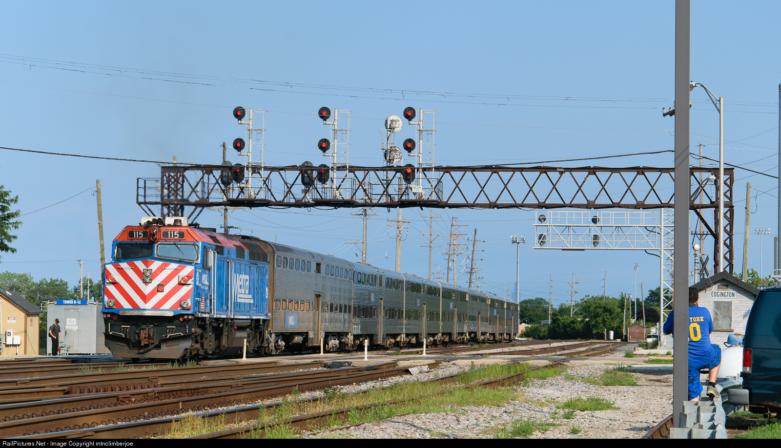An F40PH shoves an inbound Metra train towards Chicago after making a station stop in Franklin Park. The train passes under a classic signal bridge at Tower B12 on CP's Elgin Sub.