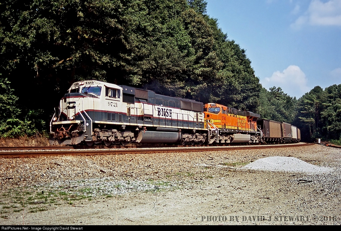 | Another empty Scherer coal train graces the rails of NS's Atlanta North District at Hiram, Georgia in August 2003. BNSF SD70MAC 9721 was still looking good in it's as built appearance as it lead BNSF ES44AC 5740 which was one of a small group to be delivered in the h2 attire.