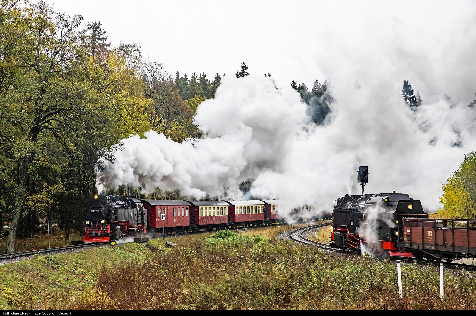 15 minutes late, steamtrain 8923 of the Harzer Schmalspurbahnen (HSB) from Drei Annen Hohne to the Brocken is leaving the station, pulled by 2-10-2 99 # 7235, while train 8904 from Eisfelder Talmühle to Wernigerode with 99 # 7245 has to wait at the entrance signal.