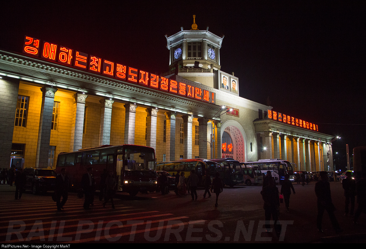 This could be a railway station anywhere in the world (albeit not with korean writing), but the two portraits of Kim Il Sung and Kim Jong Il tell you this can only be one place.....