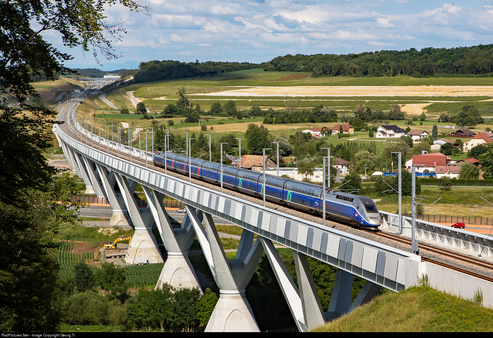 | TGV 2N2 (Highspeed train doubledeck second generation) "Euroduplex" (capable to run in France, Germany and Switzerland) # 4706 is running the TGV 9580 from Frankfort to Marseille-St-Charles over the new Rhine-Rhone Highspeed line. The train is crossing the longest (792 metre) viaduct on the LGV Rhine-Rhone, the viaduct de la Savoureuse near the Belfort-Montbéliard TGV station (visible in the background) with up to 320 km p.h. The TGV 2N2 are produced in several works like Reichshoffen, La Rochelle and Belfort, but assembled and tested only some 7 kilometres from this point in Alstoms Belfort plant. |