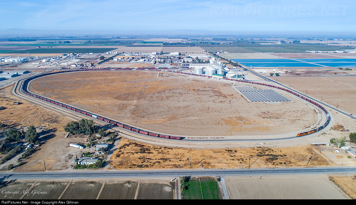 A 115-Car Worm Chasing It's Tail. Looking like something right off the set of your club's model train layout, BNSF 6513 along with four other GE's idlle quietly this morning on the large, fairly new ballon track at the Pitman Family Farm grain facility just south of Hanford. While a pair of SD40-2T's are generally the power for these moves, the road power that brought this train in was elected to stick with it for the duration of its unloading.