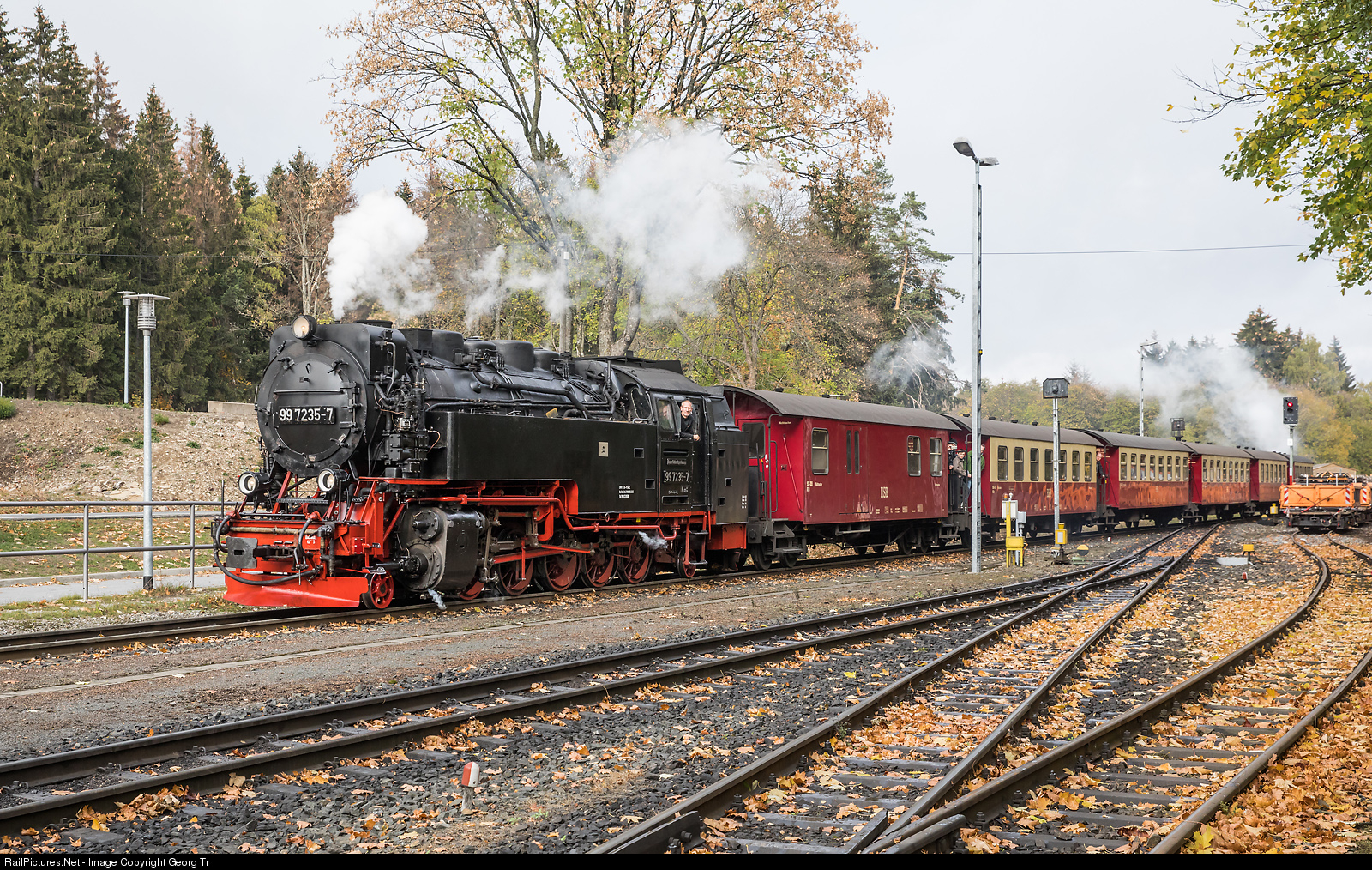 | Train 8937 of the Harzer Schmalspurbahnen (HSB) from Wernigerode to the Brocken is entering Drei Annen Hohne, pulled by 2-10-2 steamlocomotive 99 # 7235. |