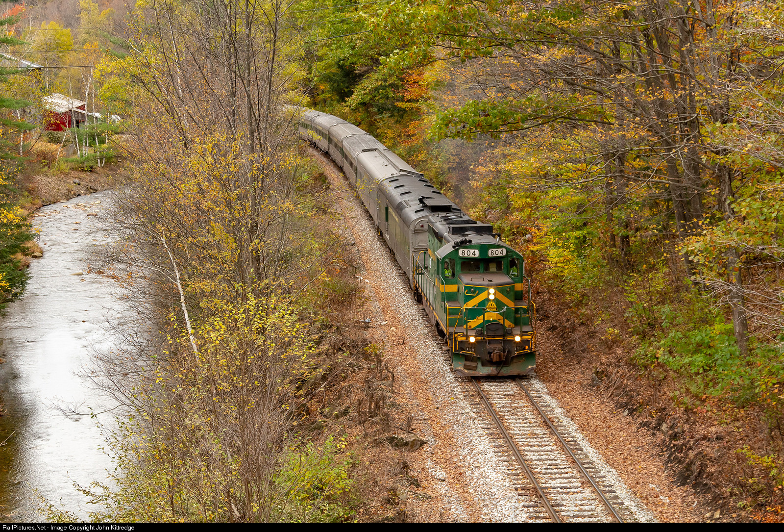 Green Mountain Railroad's Fall Foliage train lead by veteran GP9R 804 rolls along the Williams River as it enters Cavendish Gulf