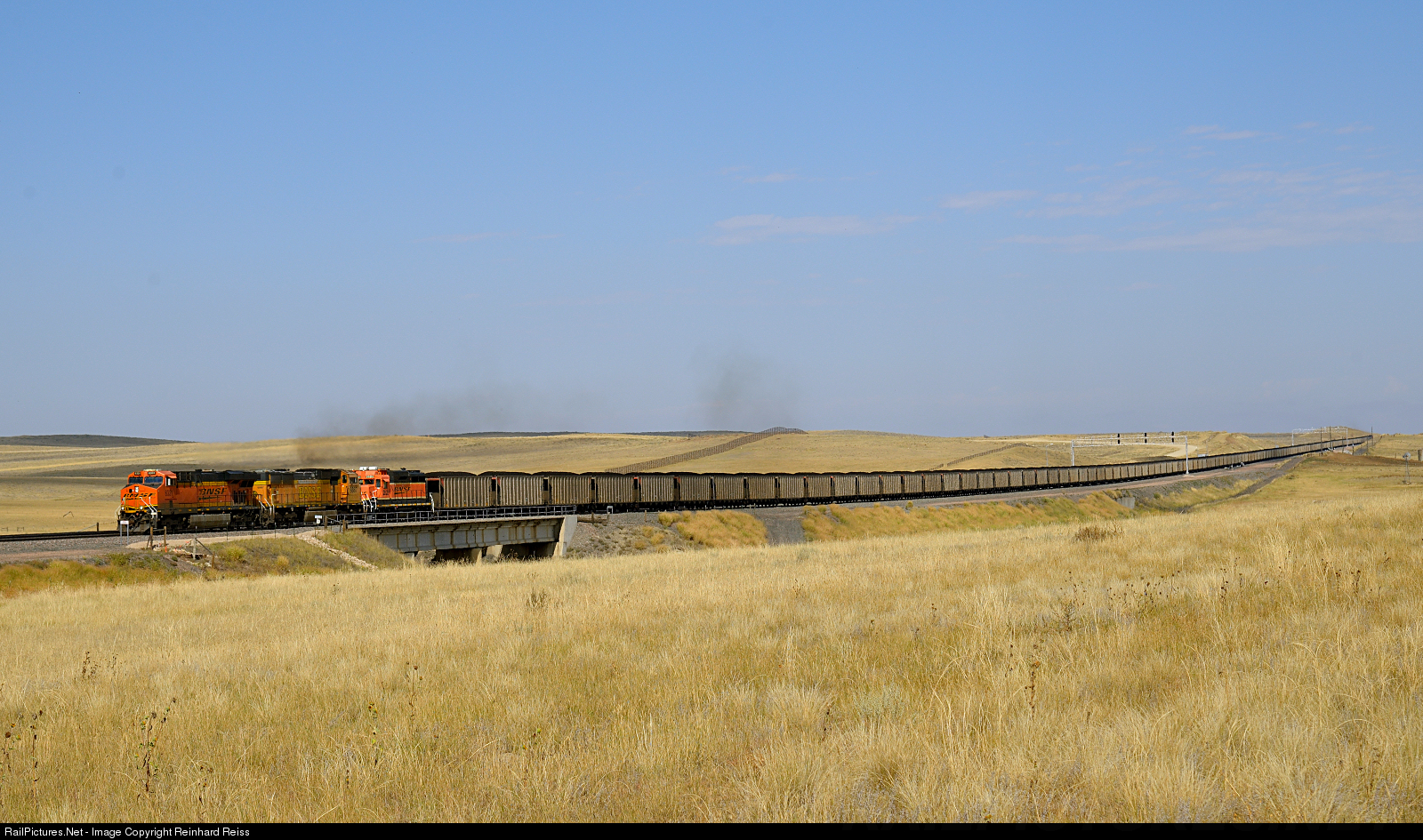 BNSF 6331 (GE ES44AC), 9887 (SD70MAC) & 2828 (former GP30, rebuilt as GP39-2M) head a coal train south of Bill (WY). BNSF 8426 (SD70ACe) shoves on the rear.